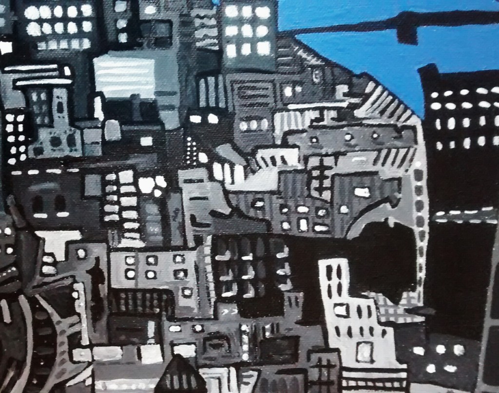 I’ve tried to use her technique but the pattern from one a couple of my old paintings : The Shard – which I’ve now painted over with grey paint to make room for something else, and New York City which is framed above my desk.