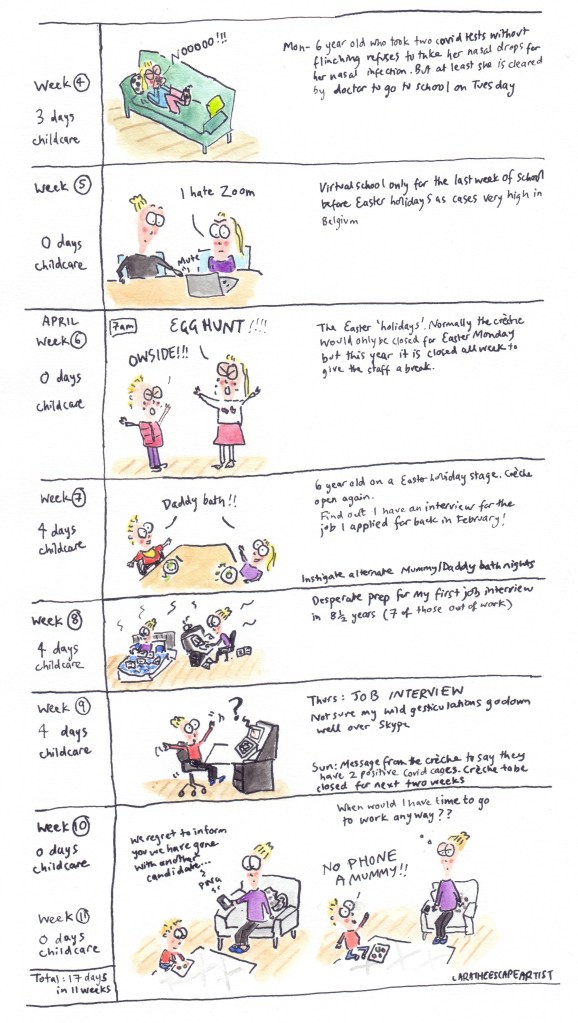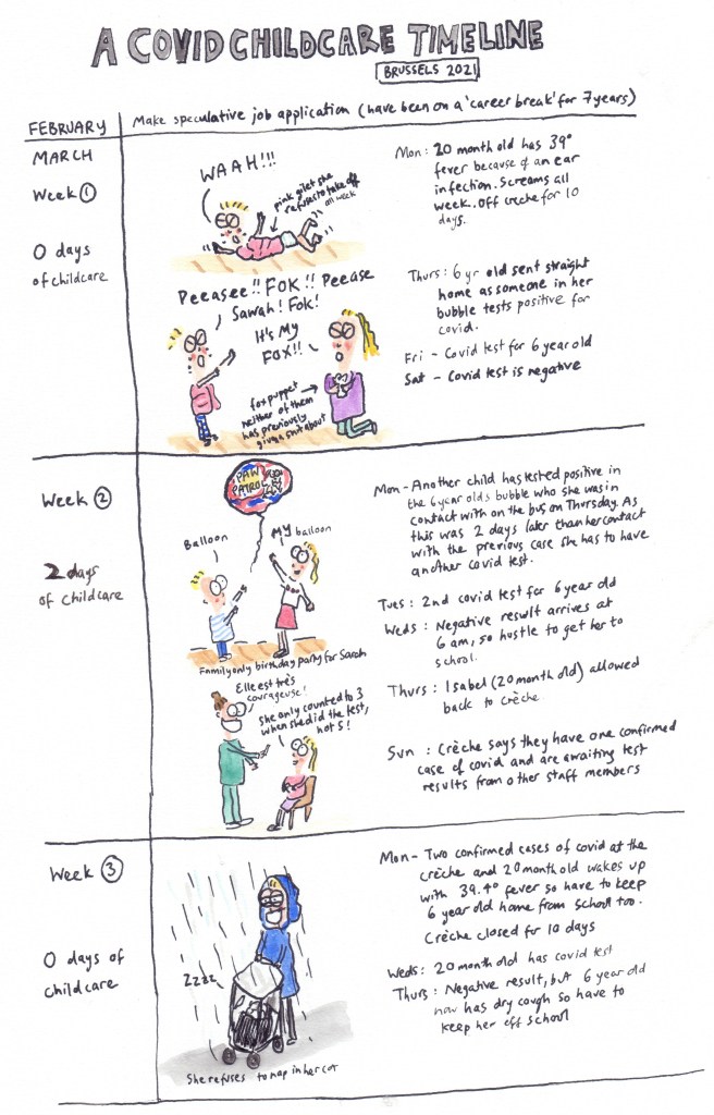 Up until March 2020 when the Alpha strain of Covid started to really take off in Belgium we were incredibly lucky that neither the creche nor Sarah’s school had to shut down either of the girls ‘bubbles’ (and obviously also very lucky that none of us actually got Covid), so I just had to deal with the usual time off creche during the winter with the younger one when she got ill, but during March the sh*t really hit the fan..