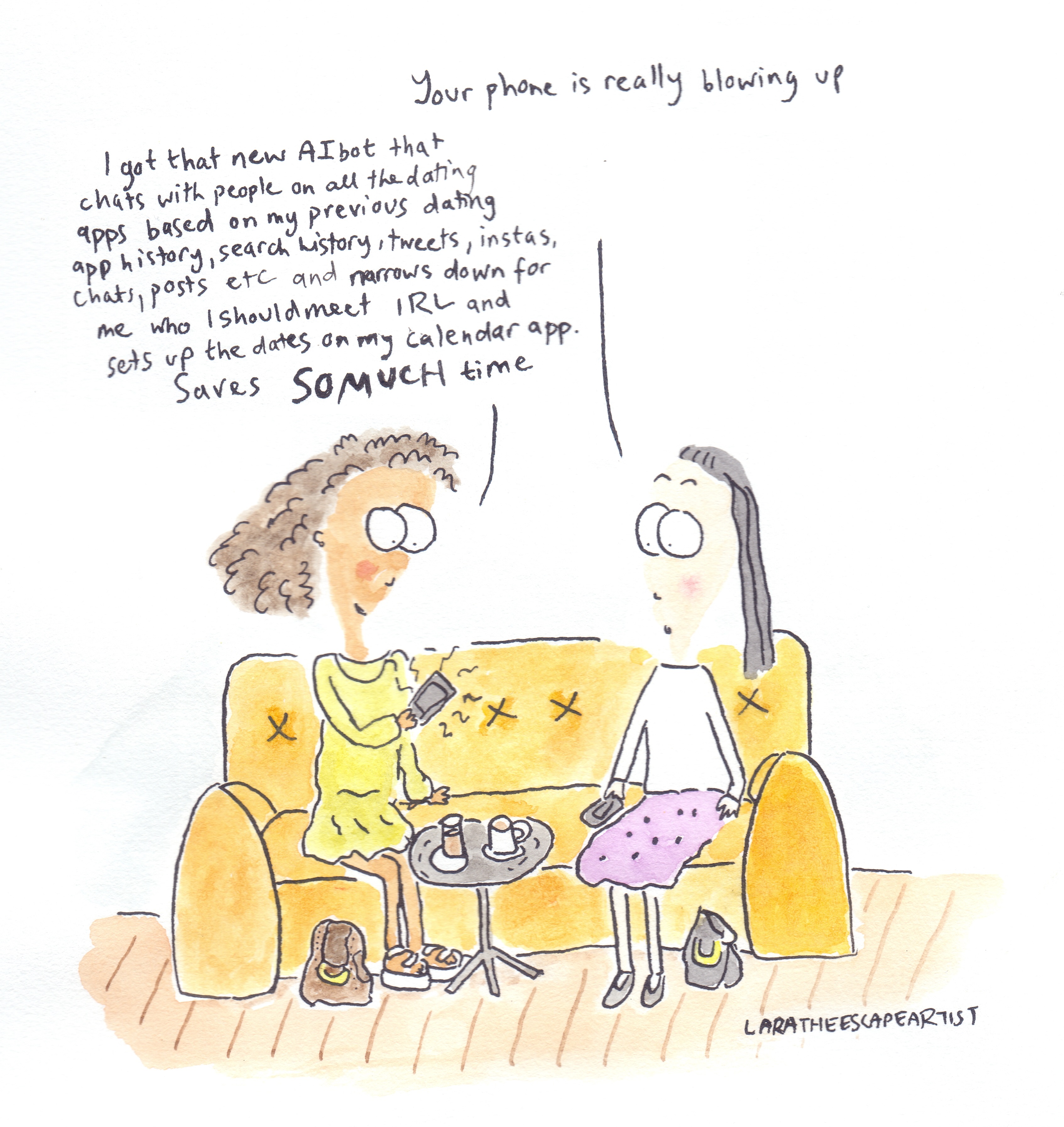 Inspired by that engineer who thought his AI chat bot had gained sentience and the amount of time and effort that online dating takes.