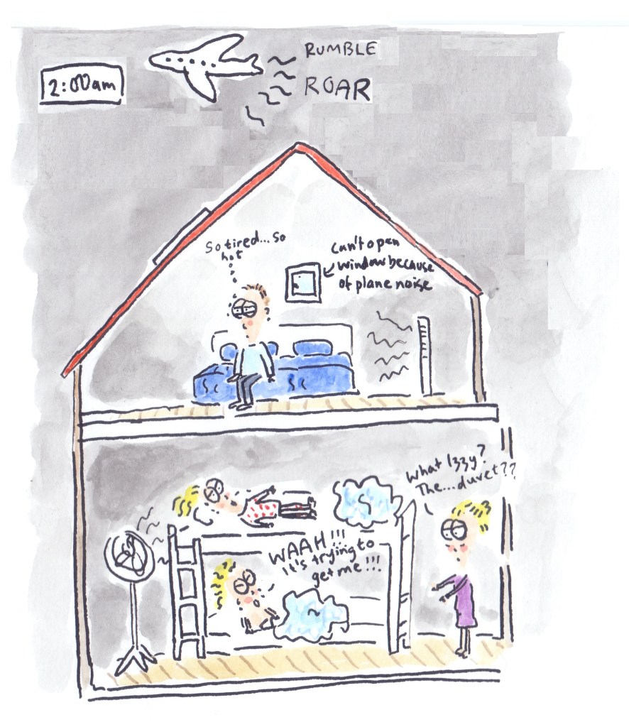 This is our families version of the typical fun in the sun* front page news photograph VS the unphotographable night time heat stress made worse by plane noise: