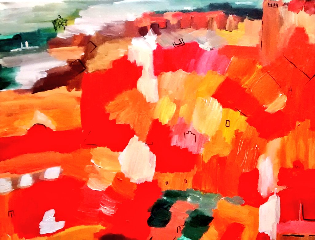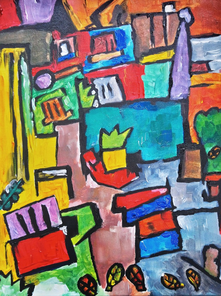 I’ve always had an interest in buildings and architecture, and I used to mainly paint cityscapes. Usually I’ll do a sketch and small watercolour painting or use oil pastels to try out different colours, before then doing a larger acrylic painting. Since the birth of my eldest daughter and then the birth of our second daughter I’ve not had so much time to paint, and I’ve concentrated mainly on drawing cartoons about my daughters. However, during the lockdown in 2020 I restarted painting but this time only things I could see from the window. Below are two of these paintings ‘View from the window’ and ‘The garden in autumn’: