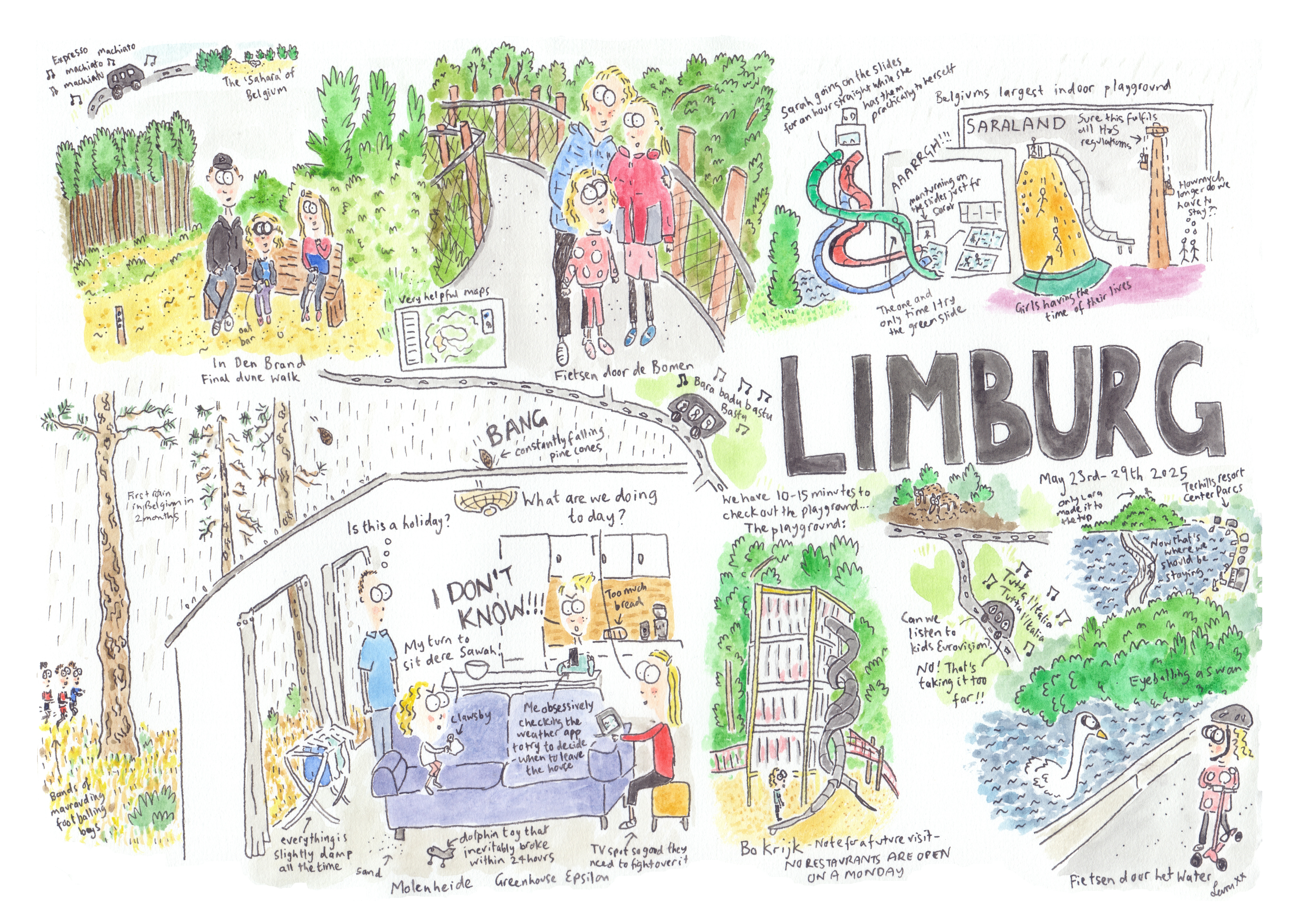 For the girls half term holiday we went to Limburg, which is an hour and fifteens minutes drive from Brussels. We got a bit unlucky with the weather because it rained everyday we were there when there had been an almost 2 month long drought in Brussels just before we left. There is so much to do there though that it worked out fine, we managed to time our excursions to walk on the sand dunes and see the amazing cycle paths through the trees and the water for when it was dry, and to go to the indoor playground and pool area when it was wet.