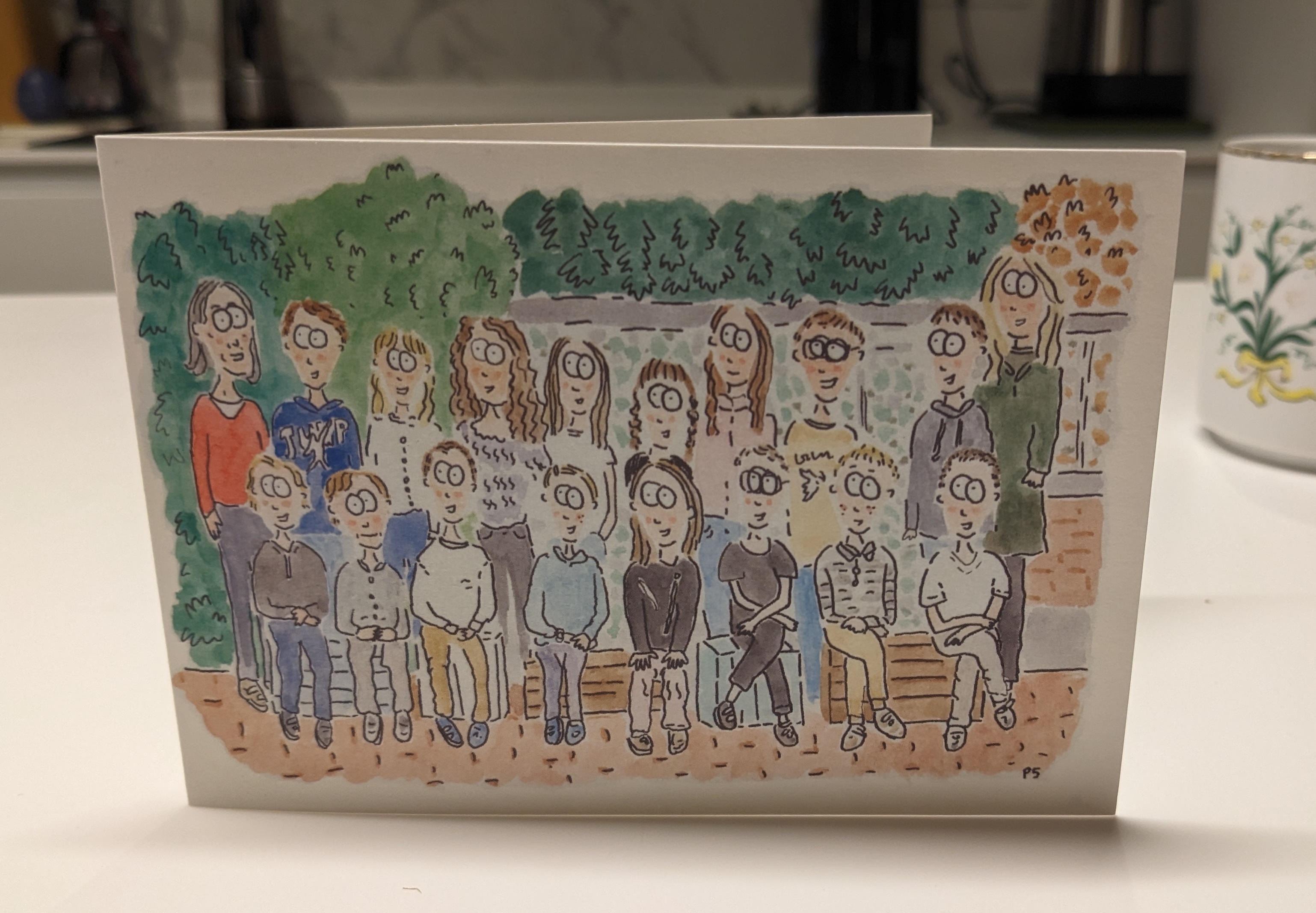 My daughter has had a substitute teacher for the past 6 months as her usual teacher was on maternity leave. As a leaving present for the substitute teacher I painted this picture of their class and had it printed on a card for the class to sign.